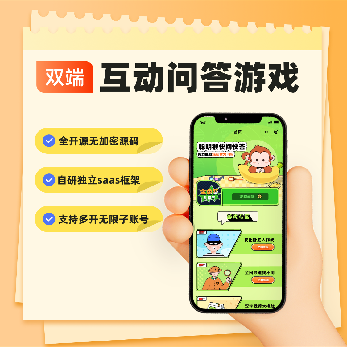 ¥698快问快答小游戏是一款专为微信小程序与抖音小程序打造的高互动答题游戏产品。支持多端快速部署,无需从零开发,适合品牌活动、商家引流、教育培训、社群互动等多种场景,通过轻量级的问答玩法,帮助你提升用户停留时长、增强用户粘性、实现高效裂变推广。